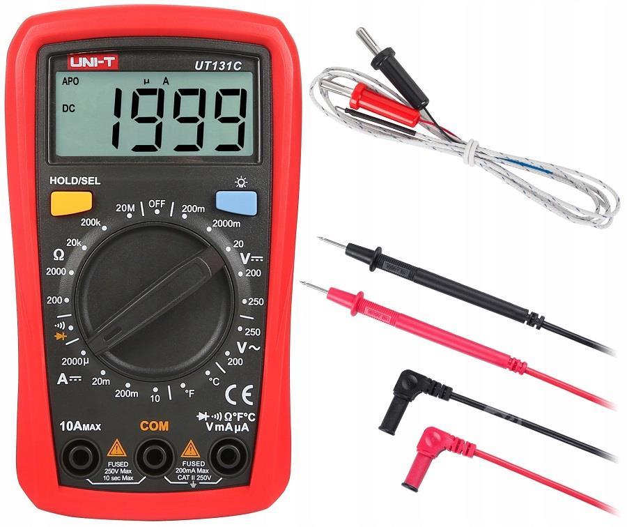 Digital multimeter with test leads and temperature probe 250V 20MOhm UT131C UNI-T The next-generation UT131 series redefines performance standards for entry-level digital multimeters. Our innovative industrial design ensures these products can withstand drops from 2 meters. The new LCD display layout offers a better user experience. This series ensures that users can work safely in a CAT II 250V environment. Special features are: temperature measurement (UT131C); Certifications: CE, UKCA, cETLus Brand: UNI-T EAN code: 6935750513279 Supplier code: UT131C Clear LCD display Convenient protective cover, with groove for hanging tips 2 meter drop test, precision protection Loud buzzer sound Ergonomic design Specifications Range UT131C DC voltage (V) 200mV~250V ±(0.5%+2) AC voltage (V) 200mV~250V 200V~250V ±(1.2%+3) DC Current (A) 200μA~10A 2000μA~10A ±(1%+2) AC Current (A) 200μA~10A Resistance (Ω) 200Ω~200MΩ 200Ω~20MΩ ±(0.8%+2) Capacity (F) 2nF~2mF Temperature -40℃~1000℃ ±(1%+4) ‒40℉~1832℉ ±(1.5%+5) Characteristics Display count 2000 Auto Power Off/Auto Backlight Off √ Diode/Buzzer continuity test √ Drop test 2m Test probe holder √ Range selection Manual General characteristics Power 1.5V battery (R03) x 2 Display dimensions 53mm x 28mm Weight 473g Color Red and grey Dimensions (W x H x D) 131mm x 95mm x 58mm Accessories Tip, manual