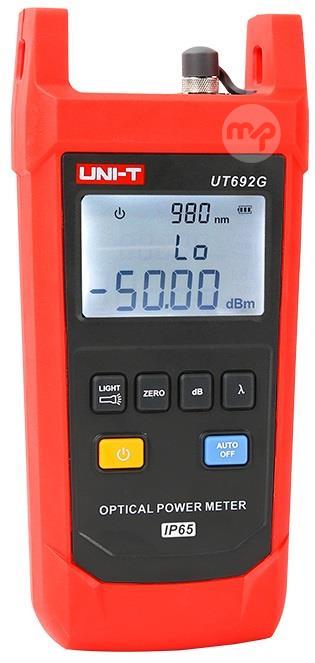 UT692G UNI-T fiber optic tester The UT692 series portable optical power meters are used to measure absolute optical power or relative optical power loss across the length of fiber optic cables.The UT692 series is designed to be durable, the meters can withstand drops from 2 m and have an IP65 dust/water resistance rating. Furthermore, the other features of UT692 include backlit display, flashlight, auto power off, wavelength storage/recall, user calibration, and ultra-wide optical power test range. Characteristics Brand: UNI-T EAN code: 6935750569214 Supplier code: UT692G Certifications: CE, UKCA Low battery indication Automatic shutdown IP65/2m drop tested Specifications UT692G Measurement range (dBm) -50~+26 Wavelength range (nm) 800-1700 Connectors FC/SC/ST universal connector (FC as standard, SC and ST adapter as options) Type of detector InGaAs Tolerance ±5% Calibrated wavelength (nm) 850, 980, 1300, 1310, 1490, 1550, 1625, 1650 Display Linear: 0.1%, logarithmic: 0.01 dBm Auto power off (min) 10 Diet 1. 5V AA alkaline battery (3pcs) Low battery indication Low battery indication at approximately 3.3V, automatic shutdown at approximately 3V Battery operating time (h) ≥60 Drop height (M) 2 Operating temperature 0℃~40℃ Storage temperature -10℃~50℃ Dimensions (mm) 189×87×45 Weight 286 Certifications CE, IP65, RoHS