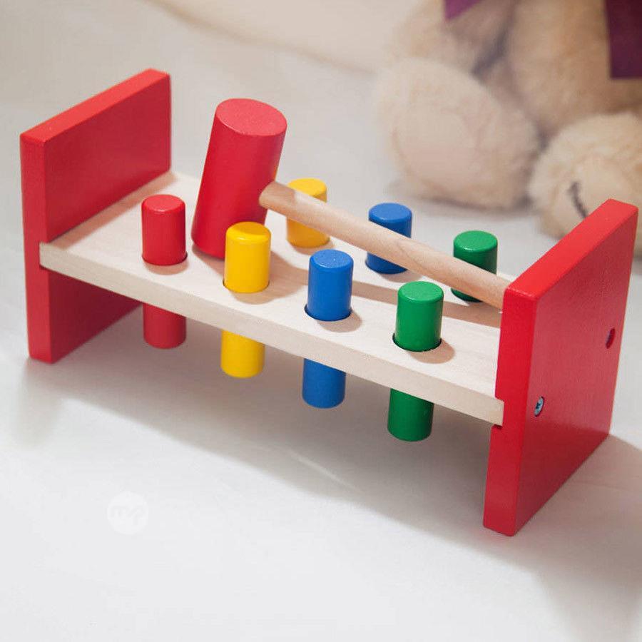 Game table with wooden hammer Marionette Wooden Toys Gaming table with 8 wooden cylinders to hit with a hammer. Through this game, children develop manual skills, movement coordination, perception of colors and shapes. Details EAN 8711252492803 Brand Wooden Toys Marionette Dimensions 107 x 87 x 230 mm Weight about 0.500 KG Material: wood Multicolored