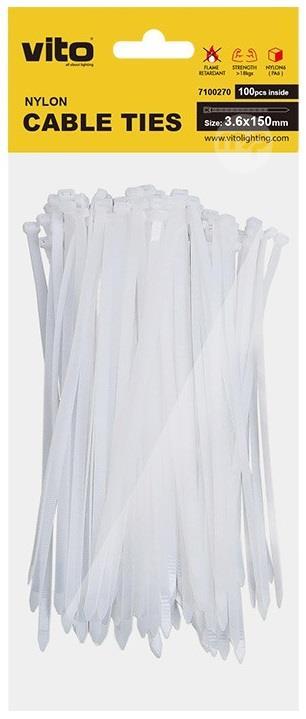 White self-locking cable ties 3.6X150mm - 100 pieces VITO PLASTICK cable ties made from NYLON 6 (PA6) are WHITE in color and have a tensile test of 18kg. There are 100 pieces in the package. The size of a tie is 3.6X150mm. Characteristics Brand: Vito EAN code: 6972538047557 Supplier code: 7100270 White color Pack of 100