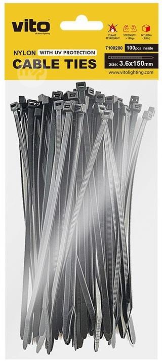 Black self-locking cable ties 3.6X150mm - 100 pieces VITO PLASTICK cable ties made of NYLON6 (PA6) are BLACK in color with UV protection and tensile test of 18kg. There are 100 pieces in the package. The size of a tie is 3.6X150mm. Characteristics Brand: Vito EAN code: 6972538047564 Supplier code: 7100280 Black colour Pack of 100