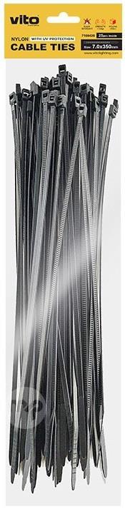 Black self-locking cable ties 7.0X350mm - 100 pieces VITO PLASTICK cable ties made from NYLON6 (PA6) are BLACK in color with UV protection and 40kg tension test. There are 25 pieces in the bag. The size of a tie is 7.0X350mm. Characteristics Brand: Vito EAN code: 6972538047700 Supplier code: 7100420 Black colour Pack of 100
