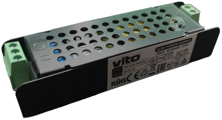 Transformers slim 12VDC 2A 25W The ZEUS series TRANSFORMERS with aluminum body have a long life. This model is also the best solution for the best lighting performance for LED STRIPS. Installation and maintenance are easy. Characteristics Brand name Vito Supplier code 6240400 EAN code 6972538040008 Power (W) Max 200 Voltage (V) 185-265V AC-50/60Hz Electrical protection Class I Color Black Dimensions 103x30x21mm