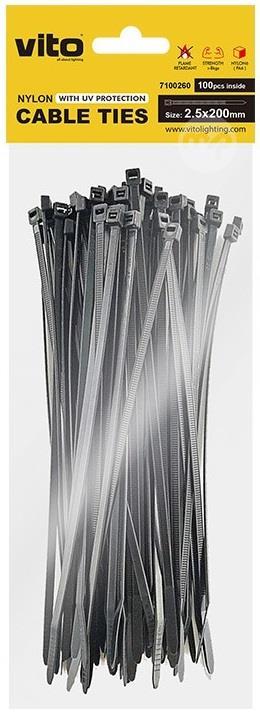 Black self-locking cable ties 2.5X200mm - 100 pieces VITO PLASTICK cable ties made from NYLON6 (PA6) are BLACK in color with UV protection and 8kg tension test. There are 100 pieces in the package. The size of a tie is 2.5X200 mm. Characteristics Brand: Vito EAN code: 6972538047540 Supplier code: 7100260 Black colour Pack of 100