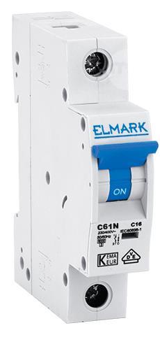 C61N 40A 1P 6kA C curve Elmark magnetothermic switch Features Model: C61N / 40A Nominal voltage: 230 V Rated current: 40 A Breaking capacity: 6kA Number of poles: 1 Extinguishing curve: B Overall size (mm): L: 72 / W: 18 / H: 81 EAN code: 3800131126634 Vendor code: 41540C