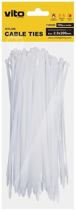 White self-locking cable ties 2.5X200mm - 100 pieces The VITO PLASTICK TIES made of NYLON 6 (PA6) are WHITE in color and have a tension test of 8 kg. There are 100 pieces in the package. The size of a tie is 2.5X200 mm. Characteristics Brand: Vito EAN code: 6972538047533 Supplier code: 7100250 White color Pack of 100