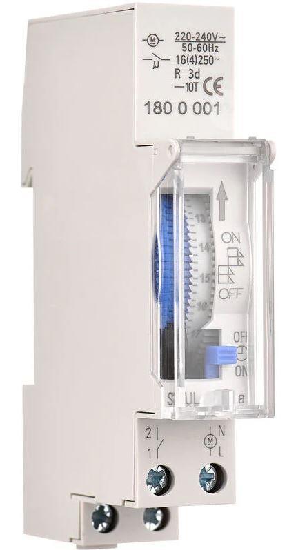 Analog timer for daily DIN rail - 16A / 250V Channels 1 x Switching Category Timer for DIN rail Indicator analog Width 17.5 mm Output power 16 A / 250 V Height 88 mm Operating voltage 230 V / AC Features Power reserve, Program on / off Column wheel 24 h Minimum switching time 15 min 96 not-to-be-missed switching cursors
