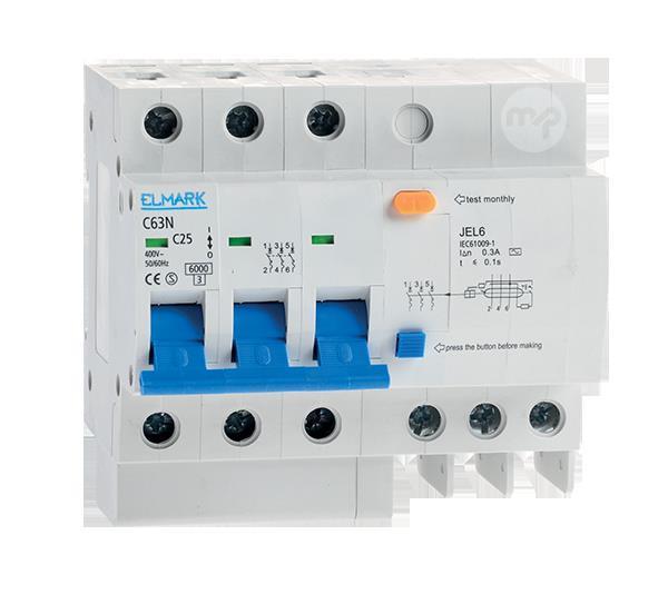 Residual current circuit breaker JEL6 C40 3P 40A/30MA Elmark Description: Circuit breakers combined with electronic differentials Technical features Rated working voltage: 230V/400V, 50Hz Residual current device reactivity: 30mA Number of poles: 3 Circuit breaker tripping curve: С Surge wear resistance: ≥2 000V Breaking capacity: 4.5 кА Triggering time: RCD <0.1s at IΔn and <0.04s at 2 IΔn Circuit breaker: <0.1s Ambient temperature: -10° ÷ 65ºС Installation altitude: up to 2000m Mounting: vertically on a DIN rail Standards: EN61009-1; EN61009-2 Model: JEL 6 C40 Rated Current: 40A Breaking capacity: 6kA Leakage Current: 30mA Brand: ELMARK EAN code: 3800131144911 Supplier code: 40340