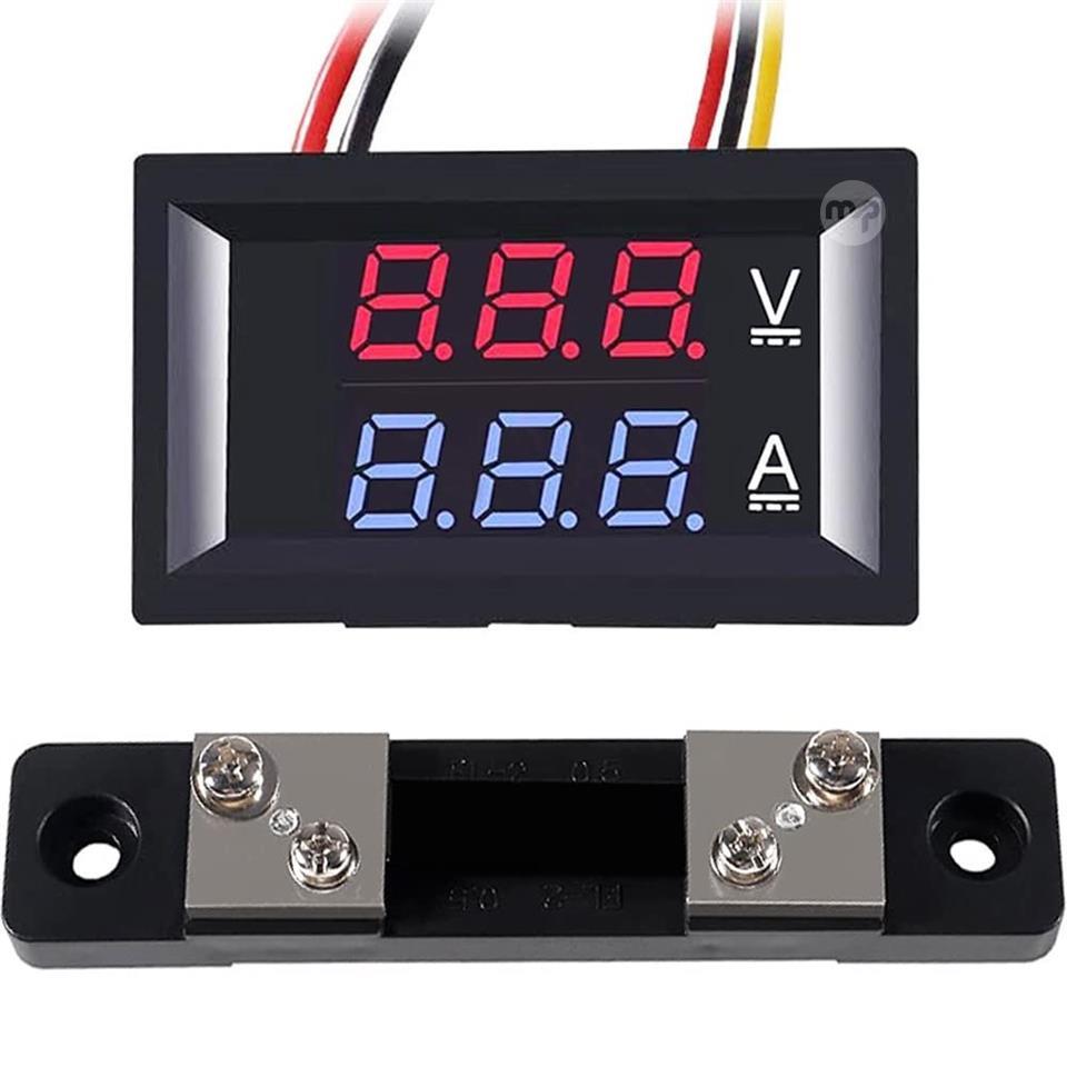 Voltmeter Ammeter with DC 0-100V 50A shunt PARAMETER --- DC 0V-100V voltage measurement; current 0-50A. APPLICATIONS --- monitoring accumulators, solar panels, model railways, campers, motorcycles, domestic batteries, engines, etc. DISPLAY --- Sharp and bright 0.28 inch LED screen displays voltage (red) and current (blue) value. NOTE --- the shunt must be connected when wiring, otherwise the meter will burn out. Product parameters: Working current: <20mA Measurement voltage: DC 0~100V Current: 50A Minimum resolution (V): 0.1V Minimum resolution (A): 0.01A Display: 0.56" LED Current Test Range: 0-10A, 0-50A, 0-100A (with 3 ranges) Display colour: red+blue Dimensions: 48 x 29 x 21mm Refresh Rate: Approximately 500 milliseconds/hour Measurement accuracy: 1% (±1 digit) Working temperature: -10-65℃ Humidity: 10% to 80% (non-condensing) Operating pressure: 80 to 106 kPa Wiring: Black wire (thin): negative pole of the no-load or step-down circuit (module) Red wire (thin): power+ Black line (thick): COM, common measure Red wire (thick) Measurement input current (+) Yellow wire (thin): measure the input voltage (+)