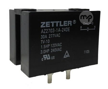 Relay DPST 30A - AZ2703-2A-220AE - ZETTLER CONTACT RATING: 30 A at 277 VAC res. 30K 1.5 HP at 120 VAC 3 HP at 240 VAC TV-10 at 120 VAC DIMENSIONS (mm): 51.5 x 34.9 x 36 NR. PIN: 6