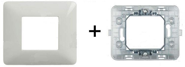 Matix compatible white plate and 2-place support kit Features Bticino Matix compatible White 2-place technopolymer plate Support 2 places Fixing screws included Media size Plate dimensions 85x85mm Inner width: 47mm Internal height: 44mm