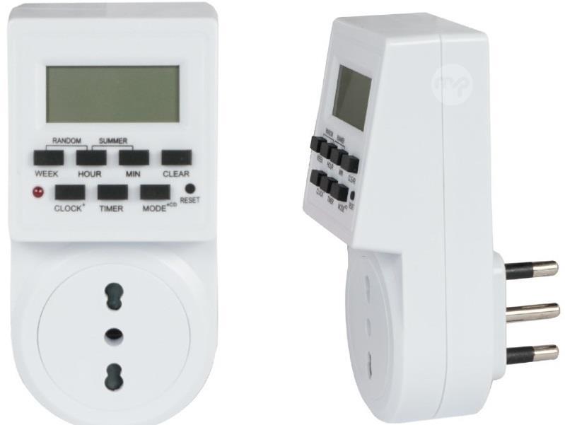 Weekly programmable digital timer with bivalent socket and LCD display Digital weekly programmable timer with memory battery. This timer made of white plastic material, has an LCD display with a 2P+E 16A plug and a 2P+E 10/16A bivalent socket, and supports a maximum of 3500W. Thanks to this timer, it is possible to program the switching on of the connected appliance, at 1-minute intervals over an entire week, day by day. These are the main features: - 20 ON/OFF programmes; - manual or automatic mode (manual on/ auto / manual off) - 12/24 hour mode; - solar time or daylight saving time setting; - random function for running programs with a random advance; -18 combinations of days or blocks of days available for programs. Before starting the timer, it is advisable to recharge the internal battery by leaving it connected to the mains for 14 hours. A very smart idea to use this timer is to connect it to the devices that we want to turn off completely at night or at particular times of the day. Technical features Typology Timer Plug 10/16A Bivalent, 16A 2P + T Diet AC 220-240V Power Max 3500W Functions 20 ON/OFF programs Manual/Auto mode 12/24 hour mode LCD display Summer time function Random function 18 day combinations Minimum setting 1 minute Operating temperature -10°C + 50°C Color White Material ABS Degree of waterproofing IP20 Dimensions 120mm x 50mm x 40mm EAN code 6956849619308