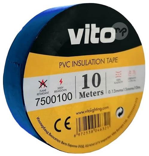 Insulating tape 15mm 10m blue The ISOLANTE series ADHESIVE INSULATING TAPES with a fireproof plastic body are long lasting and flexible in assembly. - Fireproof - Compatible with EN 60454-6 - Breakdown voltage: 7000V - Dimensions: 0.13 mm x 15 mm x 10 m Characteristics Brand: Vito EAN code: 6972538046345 Supplier code: 7500100 Blue color Length: 10m Width: 15mm Thickness: 0.13mm
