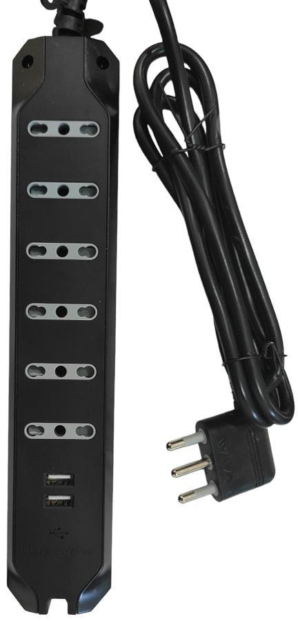6-place power strip with 2 Wiva USB sockets Characteristics Brand: Wiva EAN code: 8054890172493 Supplier code: 31500622 Spina 16A 2P+T Italian Standard Type S17 H05VVF type cable with 3 conductors section 1.5 mm, length 1.5m. Sockets with cells protected against accidental contacts 16A 2P+E sockets Standard Bypass Type P17/11 2 USB sockets 5V 2.1A max each Maximum power available 2500W Body in self-extinguishing technopolymer for high safety and mechanical resistance. Fastening loops on the sleeve and on the back