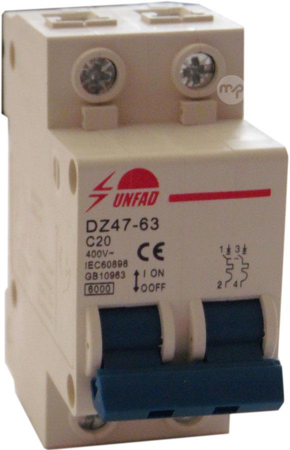 2P - C20 magnetothermal switch Number of DIN Modules: 2 Number of cycles: 4000 Break time: <0.1s Breaking capacity: 6000A Rated current: 20A
