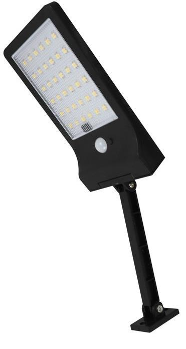 3W 440Lm LED solar spotlight cold light with PIR and twilight sensor SOLIGHT series LED SOLAR FLOODLIGHTS with ABS body and PMMA diffuser feature 440Lm lighting performance and a long lifespan of 30000 hours. This 3W model includes 6400K (COLD WHITE) LEDs with a 180° beam angle. - 5.5V polycrystalline ETFE photovoltaic panel - Battery: Li-ion 18650 3.7V 1800mAh - Charging time: 6h - Discharging time: 6-8h - Autonomy: 6-8h - Function: photosensor + PIR sensor - PIR sensor detection distance: 3-5 m - Installation height: 2-3 m Lighting modes After detecting motion it will go to maximum brightness for 15 seconds and then go back to minimum brightness. Characteristics Brand name Vito EAN code 6972538047229 Supplier code 3210190 Temperature (KELVIN) 6400K (cold light) Power (W) 3.0 Luminous efficiency 147 Lighting angle 180° CRI 80 Power factor 0.9 IP Protection IP44 ON/OFF 30000 Nominal duration (H) 50000 Light sensitivity 3-2000 Dimmable Yes Material ABS Diffuser material PMMA Color Black Dimensions (mm) 210x110mm Drums Lithium 18650 3.7V 1800mA Sensor type Twilight & PIR Lighting angle 120° Maximum detection distance 3-5m Maximum installation height 2-3m Panel material Polycrystalline silicone Charging time 6-8 Battery life 6-8