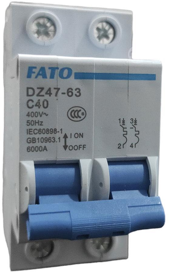 Magnetothermal switch 2P - C40 Features Number of DIN modules: 2 Number of cycles: 4000 Breaking Time: <0.1s Breaking capacity: 6000A Rated current: 40A