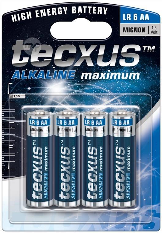1.5V LR6 / AA alkaline manganese battery The versatile energy source for everyday use. With maximum performance for safe and reliable power whenever it's needed. Especially suitable for devices with high power consumption, such as flashlights, toys, audio equipment, remote controls, etc. high efficiency for devices with high energy requirements long lasting for applications with constant and low energy consumption resistant to heat and cold, can be stored up to 7 years without loss of yield it does not contain traces of mercury or cadmium AA alkaline batteries are resistant to heat and cold. Unused and packaged tecxus batteries stay fresh and charged for up to 7 years. They do not contain traces of mercury or cadmium Battery Construction size: AA (Mignon) IEC name: LR6 ANSI / NEDA name: 15A JIS name: UM3 Technology: alkaline manganese battery Voltage: 1.5V rechargeable: no Storage capacity: 7 years Markings: BattG Blister of 4 Supplier code: 23633 EAN: 4250145110096 Brand: tecxus