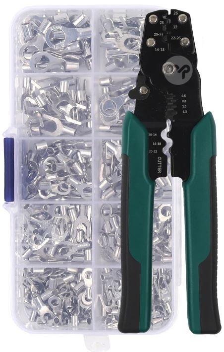 Kit 320 terminals various models and sizes with pliers Good Electrical Conductivity: It is made of high quality thick copper and has excellent corrosion resistance and good electrical conductivity. Corrosion Resistant: These wire terminals feature a tin coating that protects the copper terminals from corrosion caused by harsh environmental conditions. They are ideal for marine, automotive or outdoor use, homes, solar systems, etc. Easy to Use: Crimp terminals fit snugly and are easy to insert and crimp. Wide Applications: These cable connector kits are sturdy and safe, widely used in junction boxes, boats, golf carts, solar panels, home or outdoor, etc. Various templates included