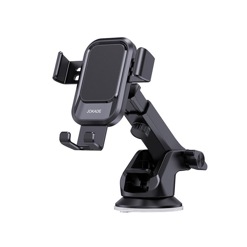 Car smartphone holder with suction cup JE009-B Characteristics Model: JE009-B Material: ABS+silicone Application place: dashboard, windshield 360° rotation, multi-angle control Strong stability thanks to strong suction cup Compatible with smartphones no wider than 5.8cm
