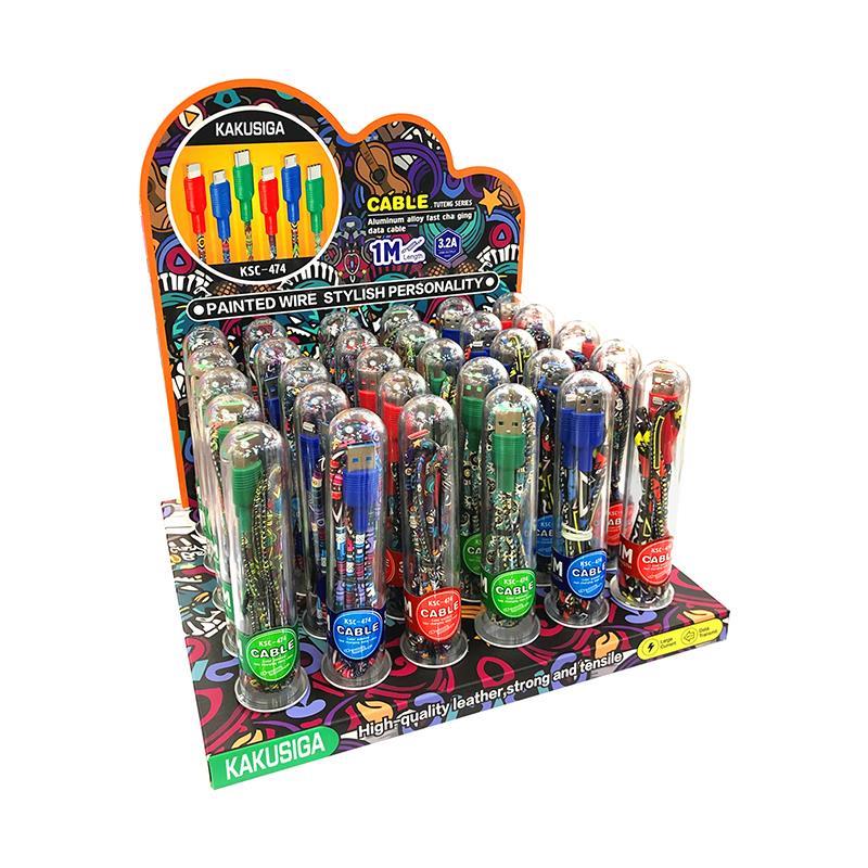 Cavo per ricarica e sincronizzazione 1m USB type C 3.2A espositore da 30pz KSC-474 Caratteristiche Modello: KSC-474 Lunghezza cavo: 1 m Rivestimento esterno: cavo di pelle, varie colorazioni Corrente in uscita: 3,2 A Connettore: USB type C 6 colori misti, rendono la vita colorata Pelle di alta qualità Nucleo filo: Rame privo di ossigeno