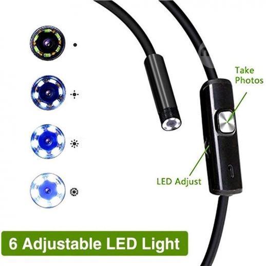 USB/micro-USB/USB type C endoscopic camera with LED light 5 meters The flexible endoscope camera is a plug-and-play waterproof peripheral equipped with a 5 meter long cable, high brightness LEDs and switchable USB/Micro-USB/USB Type C connection.The professional micro endoscope camera has a diameter of 6 mm and 6 White light LED.The endoscopic micro camera is ideal for recording, patrolling in real time and taking pictures directly from your Android Smartphone.The probe can be used in the industrial and household fields for inspections, pipe examinations, but also for analyzing small and therefore difficult to reach spaces, such as a car engine, false ceilings, cavity walls, false bottoms and much more.Equipped with a button for taking photos and recording videos, the camera can capture the image and transmit it to your smartphone or computer in real time. Technical features Lens diameter: 5.5mm Overall diameter: 6mm Lens resolution: 1280x720 Interface: USB 2.0-Micro-USB 2.0- USB type C Viewing angle 66° Waterproof level: IP67 6 LED lights Compatible Operating Systems: Android/Windows 2000/XP/Vista/7/8/10 EAN: 6917549464153 Box contents USB and Micro-USB endoscopic probe Hook with magnet Simple hook 45° mirror Hook holder shell