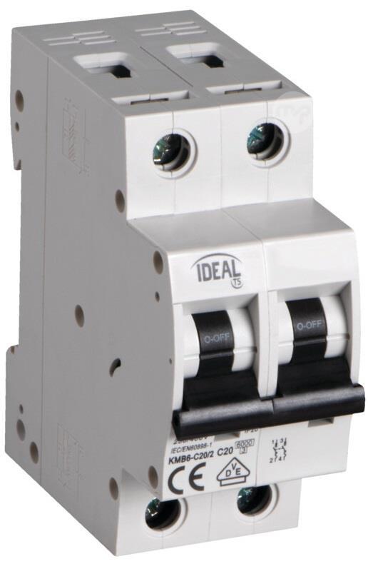2P 20A Kanlux circuit breaker Automatic circuit breaker: used for protection against overloads and short circuits. Complies with EN60898-1 standards. Characteristics Marca: Ideal by Kanlux Supplier code: 32586 EAN code: 5905339325860 Model: KMB6-C20/2 Weight and size Height [mm] 82 Width [mm] 35 Length [mm] 76 Weight 188g Technical data Rated voltage [V] 230 AC Nominal frequency [Hz] 50 Rated current [A] 20 Rated short-circuit current [A] 6000 Release properties C Energy limitation class 3 Modules 2 Application 2 IP 20 rating Sections of used cables [mm] 1÷25 Operating temperature [°C] 5÷40 Standard PN-EN 60898-1
