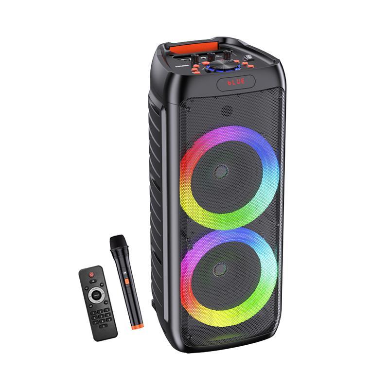 Rechargeable portable speaker 2x8" 40W LED light Bluetooth TWS/SD/USB Characteristics Model: KK-8204 Bluetooth Version: BT5.0 Black colour Chip: Zhongke Lanxun Battery capacity: 4500mAh Product size: 630*265*260mm Speaker unit: 8 inch * 2 Power 40W Charging time: about 3.5 hours Dual amplifier + treble Inputs: Bluetooth TWS/AUX/USB/SD card Accessories included Wireless microphone Remote control Audio controls Knobs for general volume and microphone Connections 3.5mm audio jack 6.35mm audio jack for microphones SD card input USB input Bluetooth