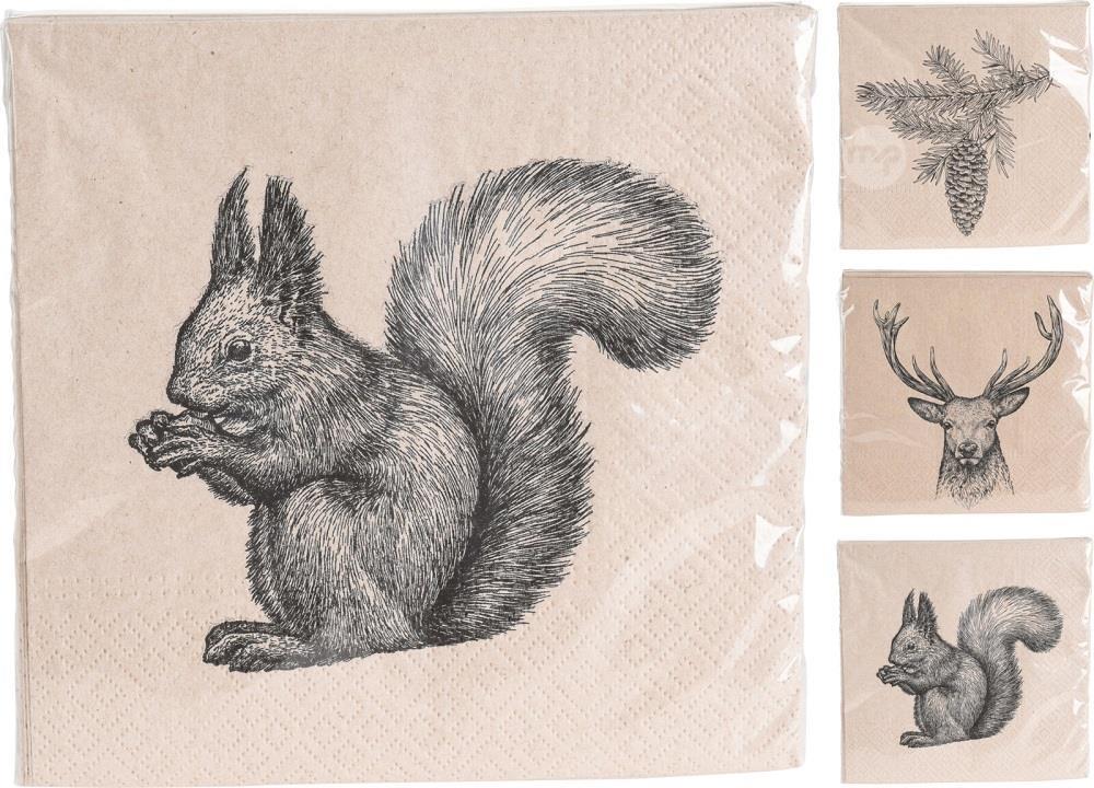 Table napkins 33x33cm pack of 20 3 Christmas patterns Features Size: 33x33 Strong paper Theme: Winter / Christmas Subjects: Squirrel, pine cone, deer Made with recycled paper 33 x 33 cm 100% recyclable water-based printing ink 3 layers bleached without chlorine agents EAN CODE: 8719987553554