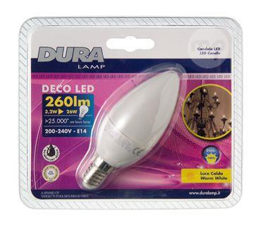 Led candle E14 warm light 260 lumens Duralamp Classic shapes : immediate replacement of incandescent lamps in any decorative application: classic chandeliers, bedside lamps, appliances where the aesthetic appearance of the lamp is important even when it is off. Opal glass finish. Extremely low energy consumption. Ceramic compartment for housing electronic components: optimization of heat dissipation and greater safety for the user. Blister pack, 1 piece. Details Duralmp brand EAN 8011905836504 Item code L037W-BSD Lamp voltage 200-240 V Rated power 3.2 W Attack E14 Flow 260 Lumen Warm light tones Color temperature 3000 K