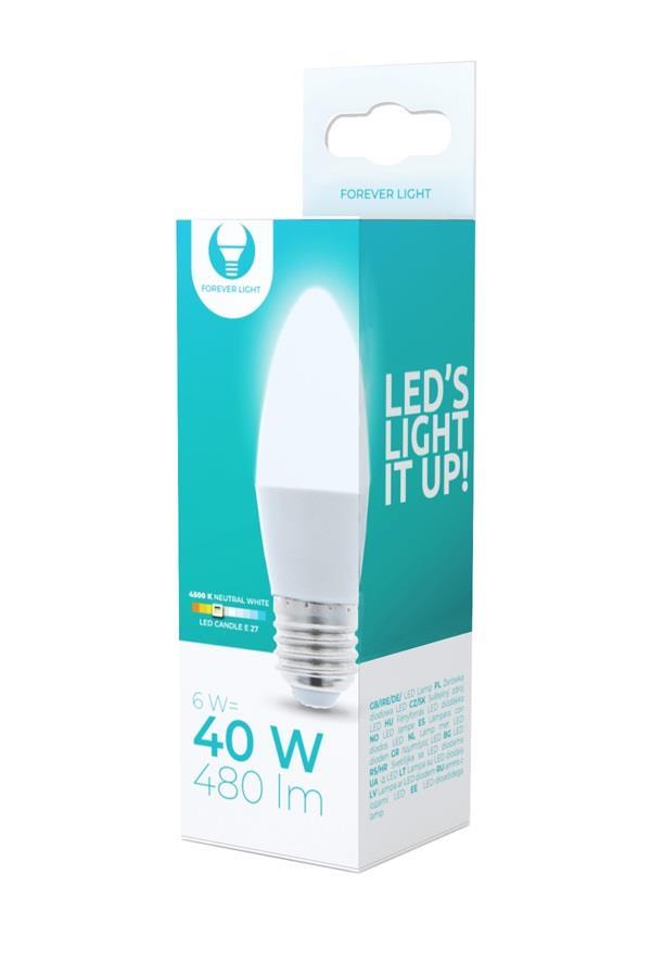 LED lamp E27 6W - Natural light 4500K Features Color: neutral white Height: 100 mm Brand: Forever Light Certificate: CE / RoHS Beam of light: 220° N. lumen: 480 lm Power consumption: 6 W Useful life: 30,000 hours Color temperature: 4 500 K Operating temperature: - 20° C to + 45° C Diameter: 68 mm Diode type: SMD2835 EAN: 5900495840004 Net weight: 20 g Warm-up duration: 1 s No. on / off: 15 000 Dimmer: no Mercury content: 0 mg Lumen maintenance factor: 70% Power coefficient (PF): 0,5 Thread type: E27 Trigger time: 0,5s Energy class: A +