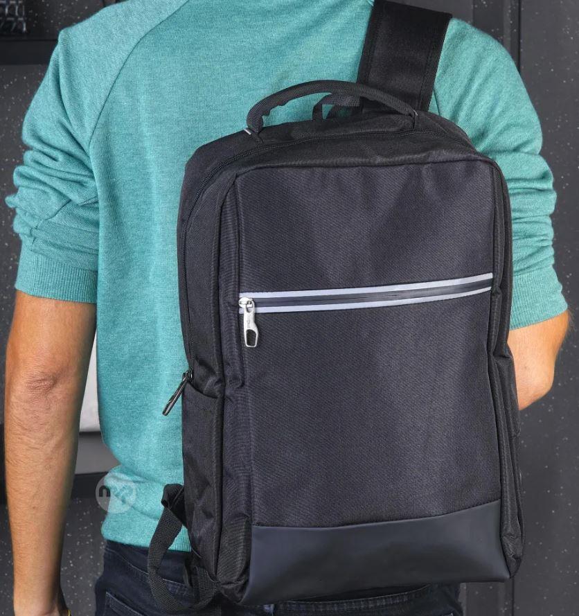 Black casual notebook backpack 43x39x10cm Practical backpack with maxi central pocket, laptop compartment, USB charger and double pocket for objects. Features: Model: backpack Material: fabric and imitation leather Central zip Laptop pocket USB charger socket 1 side pocket for water bottles Dimensions: 43x39x10cm length max. braces: 40cm Brand: Orami Supplier code: 13540