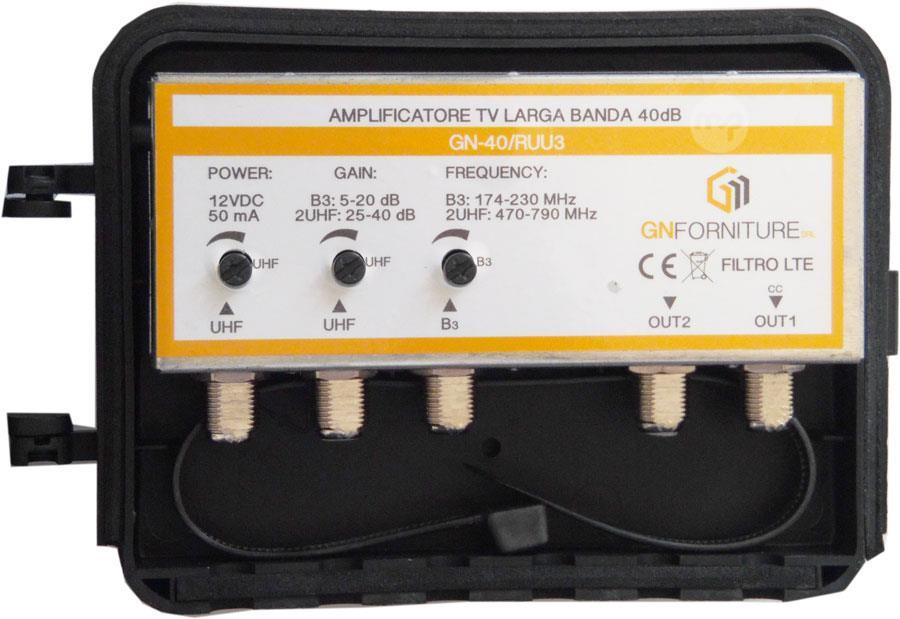 TV amplifier 40dB 2out GN-40 / RUU3 The new series of pole amplifiers with "F" connection has been designed to meet the various needs of receiving TV signals and to comply with the regulations regarding the CE marking. They are made entirely in SMD technology on a printed circuit, the housing is made of shockproof plastic resistant to atmospheric agents. Powered at 12V DC via the down coaxial cable, they have good linearity over the entire amplified band. They are all with separate B3 / UHF amplification and adjustable gain at the inputs and enjoy an excellent signal / noise ratio with low intermodulation coefficient. Suitable for single systems even with more than one socket, ideal for DTT reception. Features Number of inputs: 3 Number of outputs : 2 Separate B3 / UHF amplification UHF frequency range: 470-790 Mhz B3 frequency range: 174-230 Mhz B3 gain: 5-20 dB UHF gain: 25-40 dB Power supply 12V 50 mA Integrated LTE filter