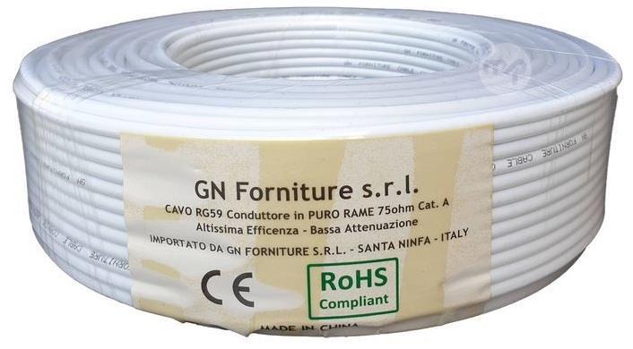 Coaxial cable TV antenna 5mm (CU) class A 100m Coaxial cable with central conductor in CU (Pure copper), 5 mm section in class A. Low loss cable and High degree of shielding. Suitable for distributing TV and SAT signals over medium / long distances. 100 meter skein Electrical characteristics Inner conductor: CU (Pure copper ) Diameter: about 0.58mm Insulation: Compact PE Thickness: 1.56mm Diameter: Ø3.7mm Shielding: Braid CCA Impedance: 75.0 Capacity: 68 Propagation speed 66% Shielding efficiency 100-900Mhz: >65 dB Internal conductor electrical resistance:<67 ohm External conductor electrical resistance: <45 ohm Cumulative losses 10-100Mhz: >20 dB Mechanical characteristics Operating temperature: -15° C / +80° C Maximum pull: 330N
