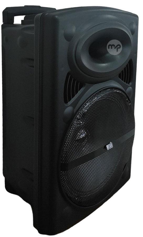 Portable trolley speaker 12" 100W LED light Bluetooth SD/USB/Radio Characteristics RMS Power: 40W Peak power: 100W Woofer size: 12" Rechargeable battery SNR: 85dB RGB LED lighting, activated via a special switch LED display Handle and wheels for easy transportation Frequency response: 45Hz - 18KHz Input voltage: DC 9V (power supply included) Equipped with stand insert Audio inputs USB SD card 3.5mm audio jack 6.35mm audio jack (for microphones and other devices) Dimensions Height: 55cm Back width: 20cm Front width: 35cm Depth: 28cm Handle height when removed: 31cm