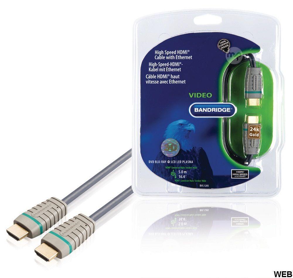 High Speed HDMI Cable with Ethernet HDMI Connector 5m Blue Digital AV connection for connecting the DVD or other device to an HD TV. General informations • Compliant with 4K2K 3D TV• 100% oxygen free copper interior• 24k gold plated contacts• Easy grip molded connector design• Signal color indicator rings Product Specifications Packaging Blister Hollow design Round Conductor material Copper Plating Gold Connector design - side A Straight Connector design - side B Straight Color Blue AWG value 28 Connection B HDMI connector Connection A HDMI connector Diameter 7.3 mm Maximum resolution 3840x2160 Cable type High Speed HDMI with Ethernet Supplier Code: BVL1205 EAN number: 8717587045967