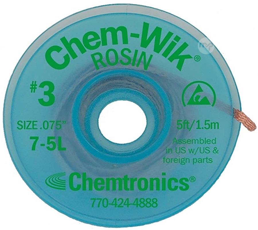 ChemWik desoldering braid 1.9 mmx1.5m The CHEM-WIK is an advanced ultra-thin desoldering wick, which responds even faster than all other watertight wicks. Its construction by intertwining thinner pure copper wires allows a better thermal conductivity, even at low temperatures. With the CHEM-WIK, the risk of overheating of critically heat sensitive components and circuits is minimized, because it requires less heat and for a shorter time. CHEM-WIK also requires less "contact" pressure, allowing for better operator comfort. Functions • 5 'Chem-Wik® Rosin coils packed in ESD-proof antistatic dissipative coils• Requires little or no post solder cleaning, no corrosive residue• Optimized weave design for faster transpiration and heat transfer• Halide free• Coated with an ultra-pure, non-corrosive R-type rosin flux• Quickly and completely removes solder• Rapid wicking action protects components from damaging heat damage Product Specifications Length 15000 mm Length 2.0 mm Supplier Code: 7-5L EAN number: 5412810196258