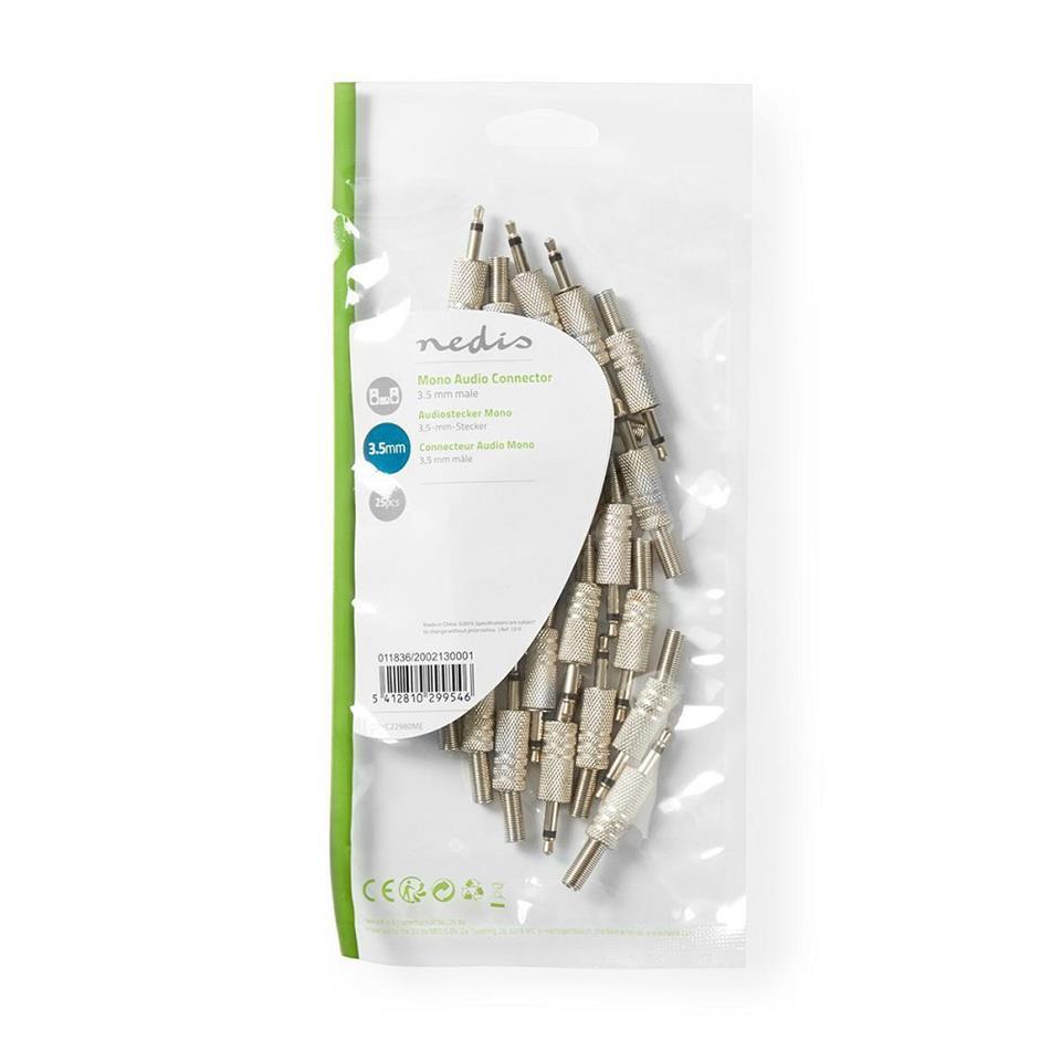 3.5mm Jack Mono Male Connector pack of 25 Product specification Color Silver Materials Metal Plating Packaging Plastic bag Link A 3.5 mm male Design connect re - side A Straight Male / female contacts Male Connector type 3.5 mm Diameter 3.8 mm Content 25 Pcs Connection A & B 3.5 mm male Supplier Code: CAVC22980ME EAN code: 5412810299546