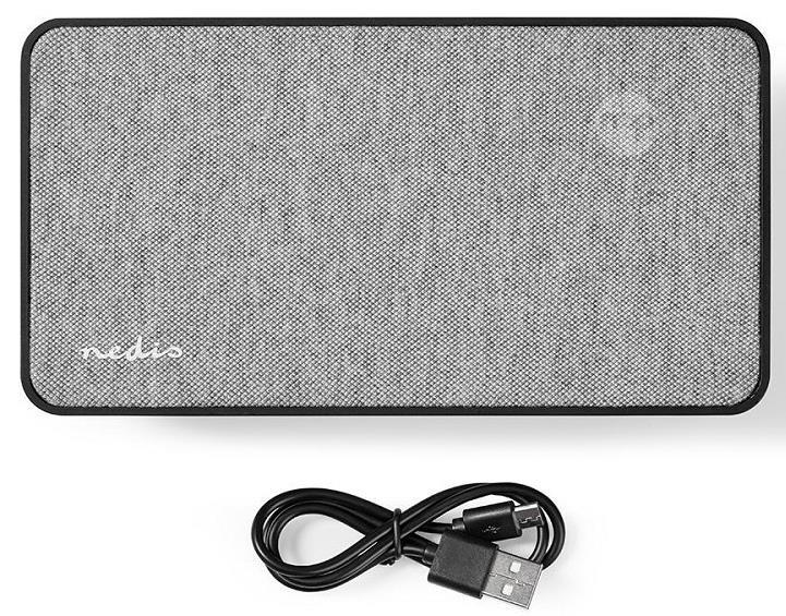 Bluetooth 15W Mono speaker Battery playback time : Up to 4 hours | Design table | 15 W | Mono | Black / Gray Take your music with you wherever you go with this stylish Nedis Bluetooth v5.0 speaker. The built-in 1200 mAh battery guarantees up to four hours of song playback on a single charge The fabric design ensures that the speaker looks as good as the audio delivered thanks to its maximum power of 15 W. The sharp top side panel lets you switch between song to song and adjust the volume easily. The integrated clock allows you to never get lost in music for too long! Features Bluetooth v5.0 technology for a stable and reliable wireless connection 1200 mAh built-in battery for playback up to four hours of uninterrupted music on a single charge 15W maximum sound power for depth and clarity Integrated clock Extraordinary and timeless design in a elegant fabric Crisp top control panel to easily change volume level or tracks Product specification Transmission frequency range 2402-2480 MHz Bluetooth signal frequency 10 m Supported wireless technology Bluetooth Power input connection (s) Micro USB Input current 1.0 A Feed type Feed to battery Power cable side B Micro USB Side A power cable USB Battery energy type Built-in lithium-ion Supported audio codec MP3 WAV Signal to noise ratio (SNR) 85 dB Battery playback time Up to 4 hours Peak speaker power 15 W RMS speaker 5 W Link input 1x 3.5 mm Battery capacity 1200 mAh Speaker channels 2 Color Black / Gray Speaker design Design table Maximum battery recharge time 3 hrs Maximum transmit power 2 dBm Maximum transmit antenna gain - 0.58 dBi Cable length power supply 0.50 m Frequency response 100 Hz - 16 kHz Audio output Mono Built-in microphone No Bluetooth version 5.0 Materials ABS / Fabric Maximum waiting time 12 hrs Weight 438.0 g Width 50.0 mm Alarm clock yes Socket Micro USB driver Size 52 mm Input voltage 5.0 VDC Supplier Code: FSBS110GY Code EAN: 5412810315710