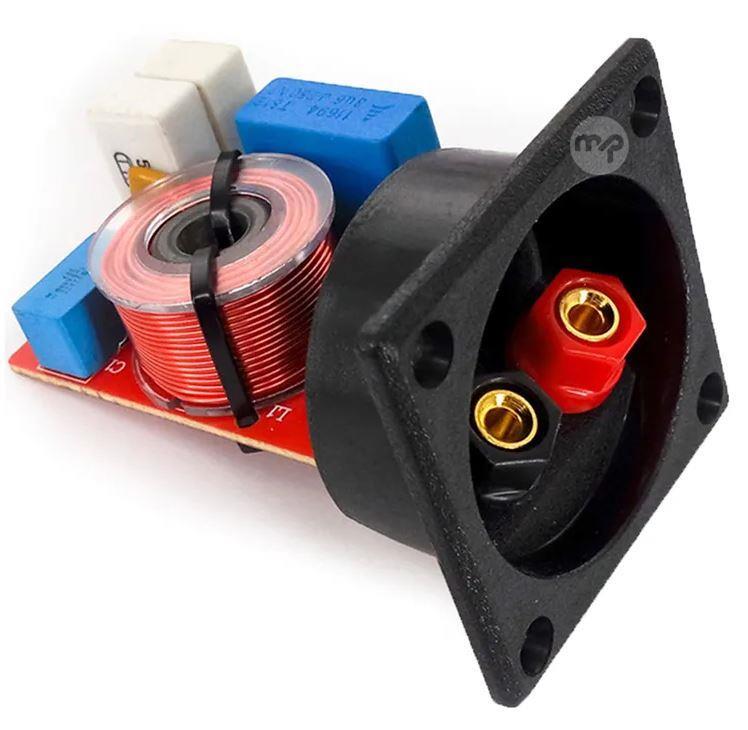Speaker terminal block with built-in crossover filter 4-8 ohm 80W NB: Some details, such as the colors of the electronic components, may vary from those shown in the image Characteristics Maximum power: 80W Frequency Response: 48Hz - 20K Hz Impedance: 4 - 8 ohms 2 way Circuit board size: 45x56mm Terminal block dimensions: 55x55mm