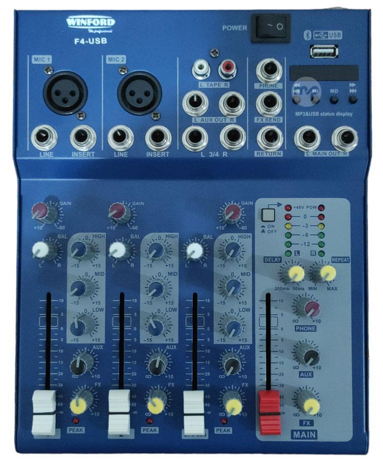 Professional 4-channel mixer with Bluetooth and USB Explore new dimensions of musical creativity with our professional 4-channel mixer, enhanced by Bluetooth and USB connectivity. Designed for music enthusiasts who want a versatile and reliable solution for their mixing needs, this mixer offers a perfect fusion of advanced performance and innovative features. Bluetooth connectivity lets you connect wireless devices quickly and seamlessly, allowing you to play music from your smartphone, tablet or laptop directly into your mix. Plus, the built-in USB port gives you the ability to play digital audio files directly from your flash drive. Characteristics Model: F4-USB 2 Mono microphone/line inputs (XLR and 6.3 mm jack) TAPE outputs in RCA Phantom power + 48V Echo Effect Generator (Delay and Repeat) TREBLE / BASS / MEDIUM MANAGEMENT ON EACH CHANNEL FX and Aux adjustable for each channel Built-in USB player (you listen to music from the pendrive) Included in the package power supply User manual