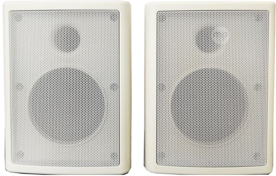 Pair of 40W 100V white speakers Features Power supply: 100V Single speaker RMS power: 10W Maximum power: 40W Connectors: spring terminal block With hole to be hung on the wall Dimensions Height: 17.5cm Front width: about 13.5cm Back width: about 6.5cm Depth: 11.5cm about