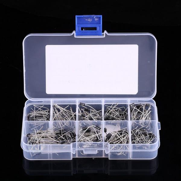 Kit 200 assorted diodes 10 types from 1N4001-1N5819 Low loss and forward voltage drop, low power loss, high efficiency. There are total 200 pieces of diodes in 10 values in this set which will meet your basic needs. All diodes are well packaged and sorted in a clear box for convenient storage. There is a label on the box so you can easily identify the type of diode you need. Diode type 20x 1N4001 20x 1N4002 20x 1N4003 20x 1N4004 20x 1N4005 20x 1N4006 20x 1N4007 20x 1N5817 20x 1N5818 20x 1N5819
