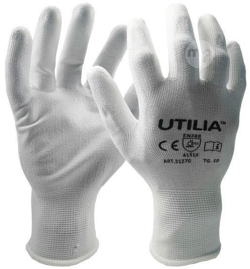 White polyurethane work gloves size 10 Utilia In elastic yarn, with palm and fingers covered in polyurethane, ventilated back, elastic cuff. Features Brand: Utilia EAN code: 9900100312700 Vendor code: 31270 Size: 10 Color: White Material: polyurethane