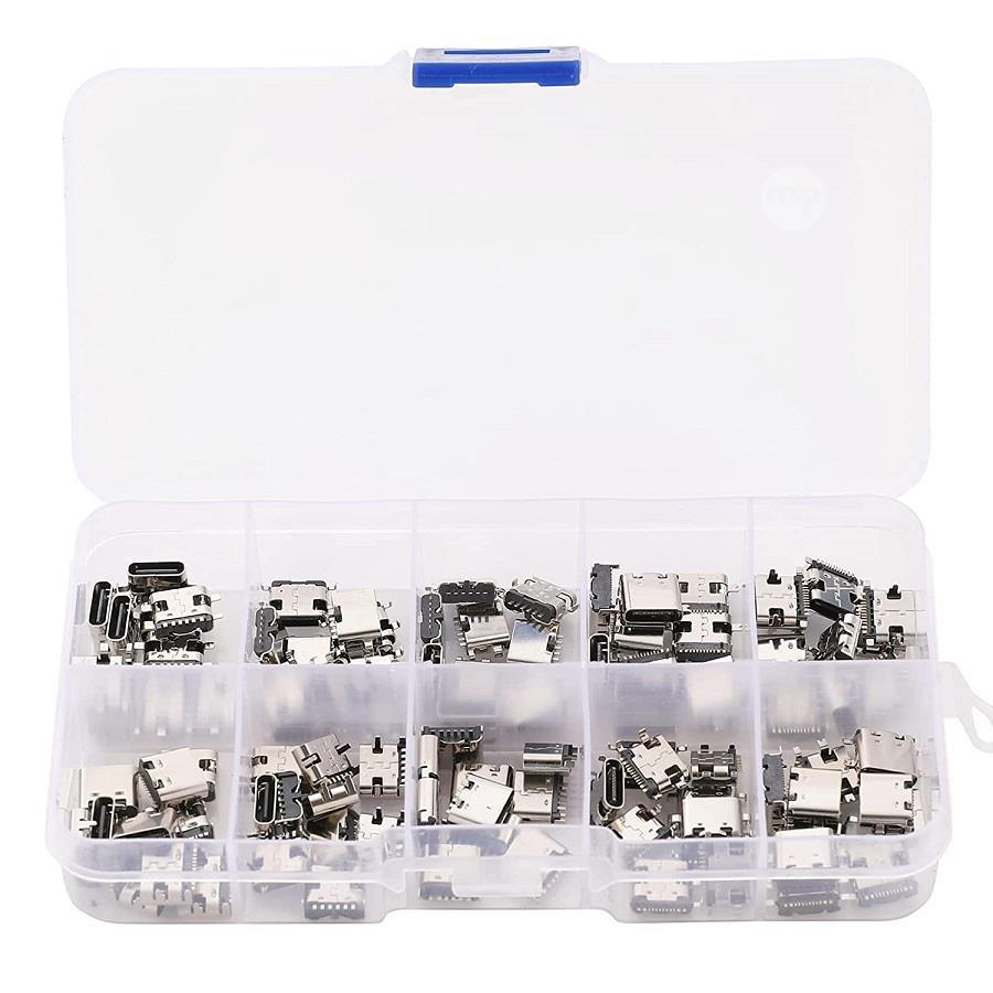 USB type C 3.1 connector kit, pack of 100 pieces INTERFACE TYPE - USB Type-C 3.1 female connector. CONNECTOR LIST - Includes 10 types of USB socket connectors in total 100 pieces, enough type and quantity to meet your needs. DURABLE - The product is made of stainless steel. WIDE APPLICATIONS - MP3 Player, Camcorders & Cameras, PDA, GPS, Mouse, Keyboard, Flash Drives or Cables PORTABLE BOX - All connectors are well packed in a clear plastic case, convenient to carry and use. Technical features Connector Type: USB 3.1 Type C Female PIN Number: 6 to 16-Pin Maximum current: 3A Voltage: 30V Materials: Plastic, Metal Color: Silver, Black