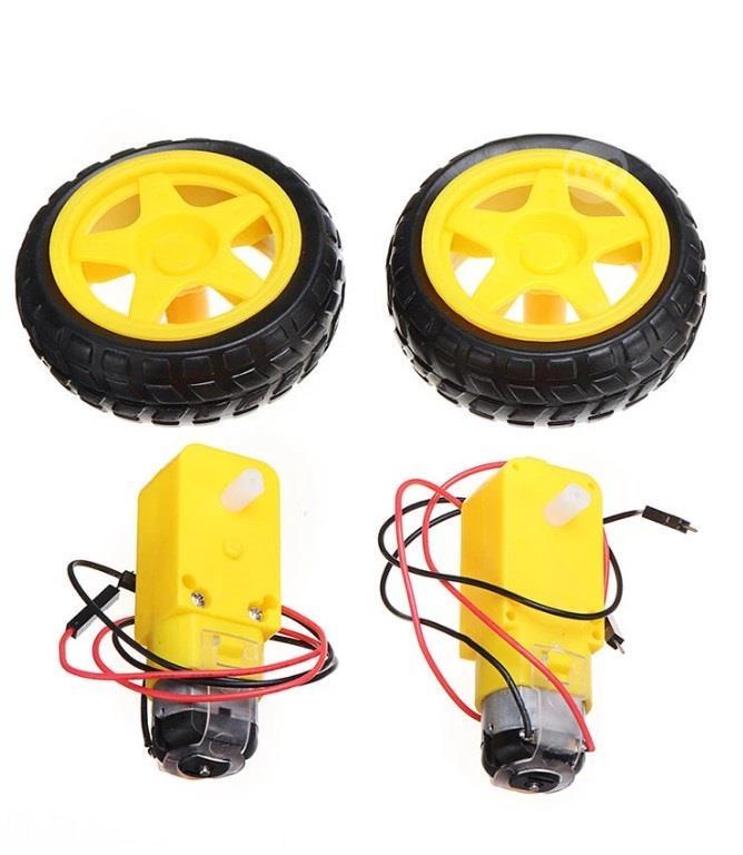Kit 4 pieces 2 wheels and 2 TT motors Realized in high quality material, resistant and practical to use. Components Kit 2x wheels 2x TT motors TT motor specifications This is a TT DC motor with a gear ratio of 1:48 Comes with 2 x 200mm wire with 2.54mm (0.1") male connectors compatible with breadboard. Perfect for connecting to a breadboard or terminal blocks Nominal voltage: 3 ~ 6 V. Current continuous idle: 150mA +/- 10% Min.Operating speed (3 V): 90 +/- 10% RPM Min.Operating speed (6 V): 200 +/- 10% RPM Torque: 0, 15 Nm ~ 0.60 Nm Stall torque (6V): 0.8kg .cm (approx.) Transmission ratio: 1:48 Body size: 70 x 22 x 18mm (approx.) Wire length: 200 mm 28 AWG Product weight: 29g / 1.02oz (approx.) Wheel specifications Wheel diameter: 65 mm (approx.) Wheel thickness: 28 mm (approx.)