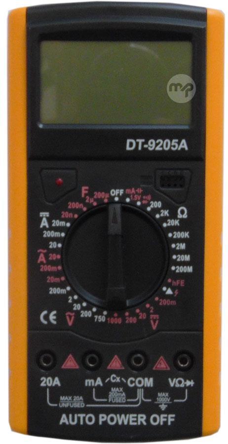 DT-9205A Large Probe Digital Multimeter Digital multimeter with test leads included. Length of tips about 70cmEAN code: 8053323552918 Functions Range Accuracy Resolution Frequency range Overload Protection DC Vol. 200 mV ±(0.5%+3d) 0.1 mV -- 1000V 2 v 1 mV 20V 10 mV 200V 100 mV 1000V ±(1.0%+5d) 1 v AC Vol. 200 mV ±(0.8%+5d) 0.1 mV 40-400Hz 700V 2 v 1 mV 20V 10 mV 200V 100 mV 750V ±(1.2%+5d) 1 v DC Amps. 2mA ±(2.0%+3d) 0.001mA 50-60Hz 200mA (FUSED) 20mA 0.01mA 200mA 0.1mA AC Amps. ±(1.0%+3d) 50-60Hz 200mA (FUSED) 20mA 0.01mA 200mA 0.1mA 20 A ±(1.9%+5d) 10mA 20A (UNFUSED) Resistence 200 ohms 0.1 ohms -- 220V 2K ohms 1 ohms 20K ohms 10 ohms 200K ohms 100 ohms 2 MΩ 1k ohms 20 MΩ ±(1.2%+5d) 10KΩ 200 MΩ ±(5%+20d) 100K ohms Capacity ±(2.5%+20d) -- 100V 20nF 0.01nF 200nF 0.1nF 2 μF 1 nF 200 μF 100nF Diodes Forward Current: 0.5mA; Reverse Voltage: 2.8V Audio Continuity Buzzer sounds if the resistance is less than 90 ΩHM.