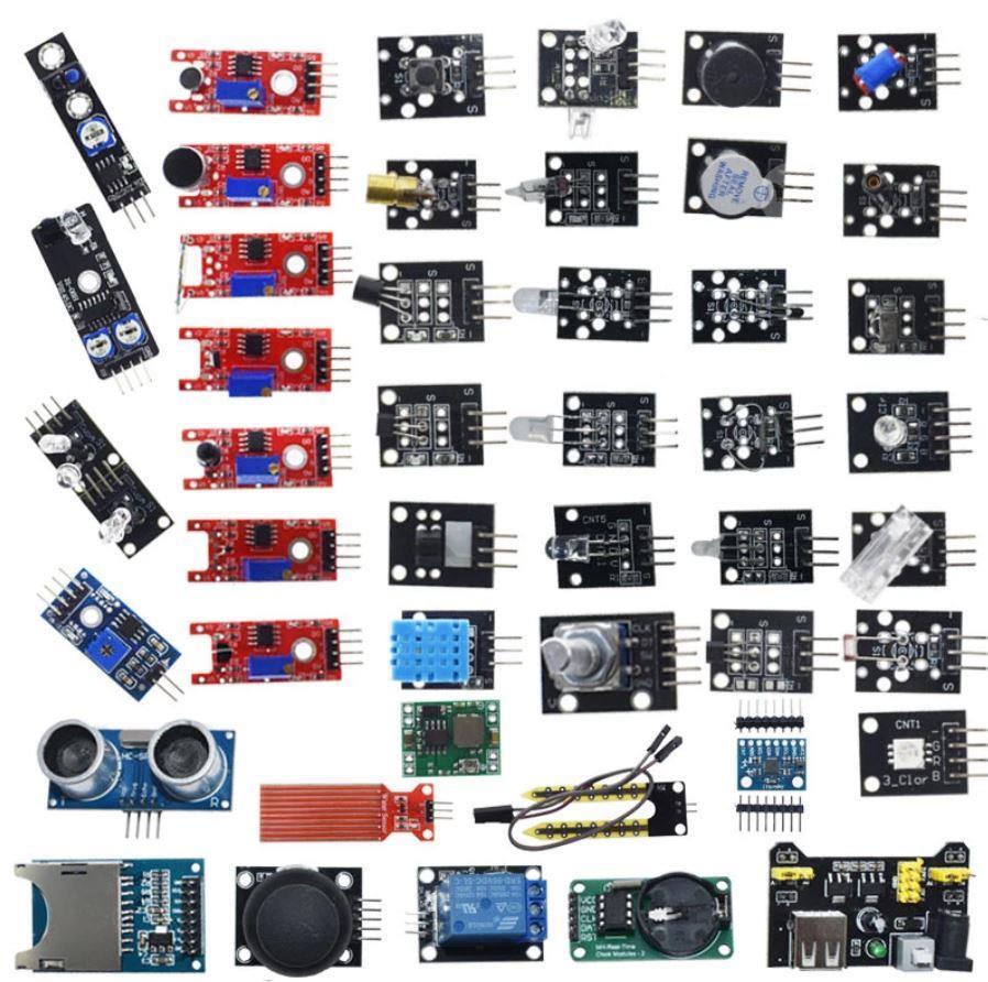 Arduino 45 in 1 sensor kit Voltage: about 5 V (depending on the specific circumstances) Sensors included in the kit 1 x PS2 joystick game controller module 1 x infrared sensor receiver module 1 x laser head sensor module 1 x temperature and humidity sensor module 1 x Infrared emission sensor module 1 x 5V relay module 1 x Smart car avoid obstacle sensor infrared sensor photoelectric switch 1 x finger heart rate module 1 x microphone sensitivity sensor module 1 x metal touch sensor module 1 x flame sensor module 1 x 3-color LED module 1 x Hunt sensor module 1 x linear magnetic Hall sensors 1 x rotary encoder modules 1 x active buzzer module 1 x Magic Light Cup modules 1 x small passive buzzer module 1 x digital temperature sensor module 1 x optical break module 1 x temperature sensor module 1 x common cathode module bicolour LED 3MM 1 x aperture module mercury 1 x Hall magnetic sensor module 1 x RGB LED SMD module 1 x Mini Reed module 1 x tilt switch module 1 x automatically flashing LED module 1 x key switch module 1 x photoresistor module 1 x vibration switch module 1 x hit sensor module 1 x temperature sensor module 1 x Holzer analog magnetic sensor 1 x microphone sound sensor module 1 x large reed module 1 x bi-color LED module 1 x breadboard power module 1 x ultrasound module 1 x MP1584EN buck module 1 x reader module of SD cards 1 x Gyro module 1 x soil module 1 x clock module DS1302 1 x water level sensor
