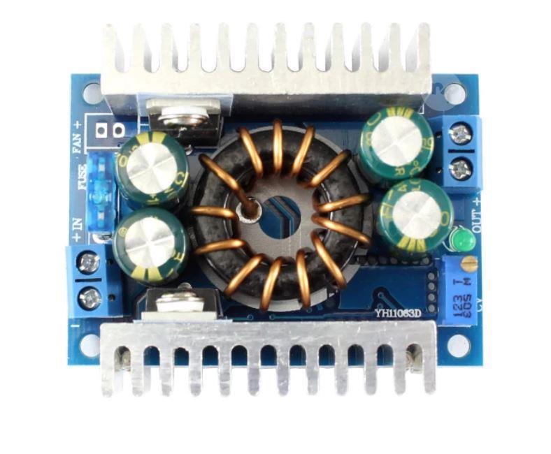 High power converter from DC 8-32V to 9-46V adjustable - 8A High power converter from DC 8-32V to 9-46V adjustable - 8A. For a DIY creation of a adjustable voltage regulator or to create a power supply for electronic equipment or to power the car or other devices. Features module properties: Not isolated module (Boost) minimum dropout voltage: 0 V input voltage: DC 10-32V (can change to DC 8-16V inp ut, please change the circuit on the back of the PCB, it is marked) output voltage: 10-46V. (If 8-16V input, output is 8-46V) input current: 16A Max. ( exceed 8A please increase the heat dissipation, heatsink not included) static operating current: 15mA (12V step up at 20 V. The higher the output voltage, the more the static current will increase) output current: 8A Max. ( exceed 4A please improve heat dissipation) output power: 90W (natural cooling), 150W (with dissipation increased) operating temperature: -40 ° C to + 85 ° C (increase heat dissipation if too hot ) frequen working za: 380 KHz conversion efficiency: up to 95% short circuit protection: Yes (15A fuse input) reverse protection of polarity: None (If you need to install input port diode) installation: 4x3mm screws wiring: Clamps, do not need to solder. V-IN input, V-OUT output. format: 60mm (L) x 50mm (W) x 20mm (H) reference 16V to 19V, output current 3A, 94% efficiency 12V to 20V, output current 5A, efficiency 89.5% 12V to 30V, output current 3A, efficiency 89.2% 24V to 42 V, 3A output current, 95.2% efficiency