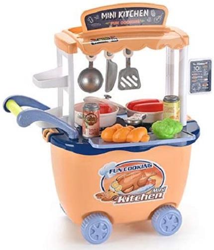 Mini kitchen play cart 28 pieces Designed with colors vivid and charming decorations for your little one to imitate breakfast or even lunch with meat and fish! They will love this food set! Cart Components 1 x Mini Kitchen Food Counter 1 x Pan 1 x Pot 1 x Lid 1 x Poached Egg 1 x Bread 1 x Cauliflower 1 x Fish 1 x Sausage double 1 x strawberry juice 1 x orange juice 1 x knife 1 x spoon 1 x spatula Features Suitable for ages 2 and up Material: plastic Pieces included in the set: 28